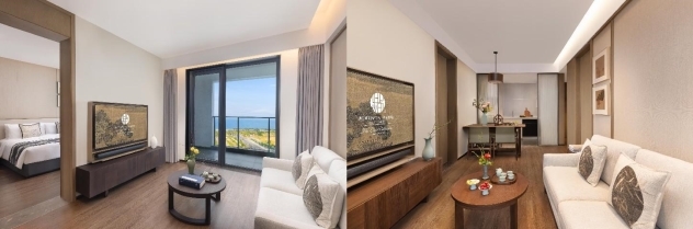 在空间设计上,物业处处藏着“宋韵密码”:大堂借鉴宋代屏风的虚实隔断手法,阳光透过全景落地窗与室内陈设交织,复刻出宋画中“天光云影共徘徊”的诗意;庭院则以北宋“西园雅集”这一文人盛事为灵感,将千年风雅定格为可漫步、可体验的园林景致。同时,物业也兼顾现代旅居需求:从单房公寓到三房复式套房,适配高净值人群、国际商务人士、亲子家庭等核心客群;客房内配备高品质家庭影院与设施齐全的厨房,满足舒适居住需求;毗邻海滨的地理位置,更让住客在沉浸宋韵的同时,能轻松衔接海岛风情与城市烟火,实现传统美学与现代生活美美与共。